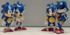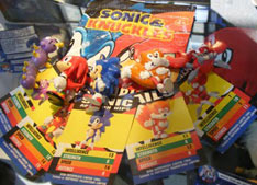 Also in the gallary, is a collection photo of the PVCs you've seen on Display Figures and in the UK Section. Caterkiller, Knuckles, Sonic, Tails & Crabmeat all appear here, but the new element is the cards you see below them. They have stats at the bottom (Strength, speed, etc) like you would see on Pokemon or other types of trading cards. Did the cards come with the figures? Are the a separate card game no one has yet mentioned? The cards appear to have figure photos on them, so it's unlikely they were a separate set. Also, this display looks like it appeared at a Summer of Sonic--so someone has to know something about them. If you do, write in for credit!