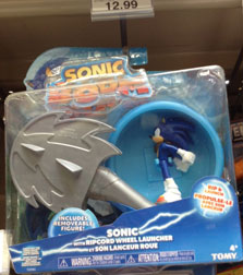 In the gallary is the MIB shot of Sonic Ripcord Wheel Launcher. You can see the little figure in there (dot says 'removable figure'), the silver colored launching handle thing & the other dot says "glowing wheel". Does it light up? Does it glow in the dark? The figure there is their 3 inch scale one, but the whole toy is 12.99 at Toys R Us.