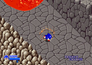 It's seldom-seen because there were few machines made, and it was never ported to anything. This game was the first with Mighty & Ray, of which Mighty only ever appeared again in Chaotix. The gameplay often (or maybe always) was 'chase' style, where some hazard (in this case lava) was rapidly going after the characters, pushing them to run faster through the level. Look where the character is on the screen: about mid-way, and that's on purpose so that any obstacle coming ahead would be difficult to miss. So you're rushed down a set path making snap decisions ahead of an insta-kill hazard.