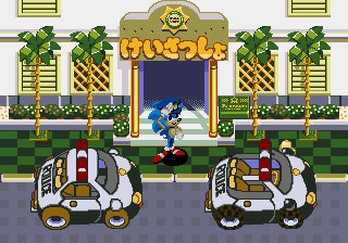 Along the way, the action pauses to let a group of flickies cross the road. As the ride resumes, things remain peaceful for another short period of time, then Eggman shows up and starts shoving cars aside. The player is expected to then activate the siren and pursue him, occasionally jumping out of the car briefly to injure Eggman. When he is damaged enough, Eggman gives up and leaves. If no action is taken long enough, however, Eggman will get away. Either way, Sonic will pull up in front of the police station and the ride/game ends after Sonic gives an ending speech in Japanese, making this the first game where Sonic speaks.