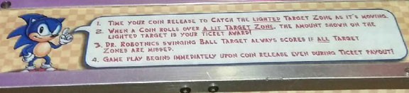 Here is a better look at the Sonic Token Roller. It's an older game for sure. The front has the instructions, Sega logo, token slot, & Sonic standing graphic. It has checkered accents like Green Hill Ground. You can see the red bubble light on top, how the interior 'game board' lights up (Its hard to photograph because it is under glass) & the nicely decorated side-pannels, complete with a graphic of a "Sonic Token" With the second photo, you can read the instructions & know how to play. You may be able to find this game if you use the Arcade Finder page.