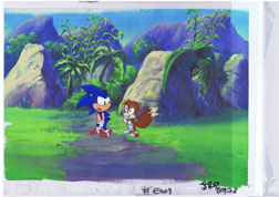 In the gallary is another animation cell from the Adventures of Sonic the Hedgehog (weekday Sonic) show. It is from the episode Prehistoric Sonic. It's another fairly special cell, as it comes with the characters Sonic & Tails on separate layers (its how the animation was made) along with the painted background. It also has the pencils for the scene underneath it all (not seen here) Unfortunately a bit, Tails' eyes aren't looking in the same direction for this shot so he seems a tad odd. Cells like this with 2 characters & the background are prized and harder to obtain.