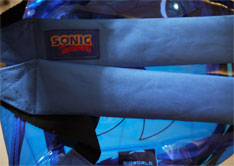 This is a 'mini backpack' type bag, modeled after a school bag, but too small to do much with. It's made of translucent blue plastic, with an opaque & outline classic Sonic art on the front. (the blue parts of him are just an outline) This has padded regular cloth straps, with the classic logo as a cloth tag (left). The top zips open, and it has no extra pockets. This can be found at Spencers Gifts in 2012/winter.