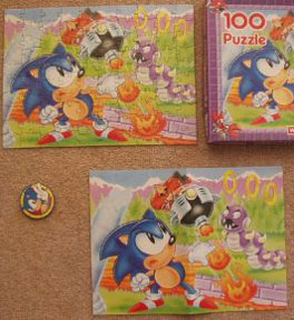 Jig-Saw Puzzles. Notice that Sonic has the exact same expression on 3 out of the 4 puzzles. These came with a round...token or something. Someone has put together their puzzle. You can see the round widget, and that the puzzle does not end up very big when you are done. Also: Poster-like object.