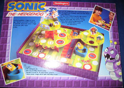Another curious game. This is a sort of put-together pop-up game made of cardstock paper. You place Sonic cut-outs into plastic stands and hop them over the board, avoiding badnik pictures and landing on ring spaces to win.