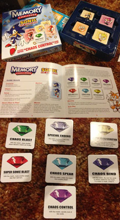 The (very) old game of "Memory" returns with a Sonic theme. To play the original version (of which this is a variant) you shuffle cards, lay them out in a grid on a surface, and then try to turn over 2 matching cards. If you guess wrong, both cards must be turned back over. The gimmick here is stated on the box: "Features Super Chaos Control Game Play".