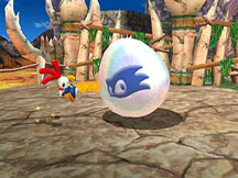 Here is a screen shot from Billy Hatcher the game. Sonic Team members worked on it too, & Billy (the kid dressed like a chicken) rolled eggs to squash nightmare things & hatch the eggs into creatures to help you. But since it's an ST item as well, Sonic can show up. If you get enough coins, a "SonicTeam" logo egg will appear, & a Sonic will hatch out & use attacks like tornados & spins to do damage & help you. You could also hatch Samba De Amigo's "Amigo Monkey". The egg at right is the one that any of those characters could hatch out of. Added info by pr0w1.