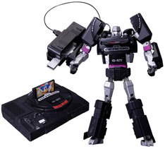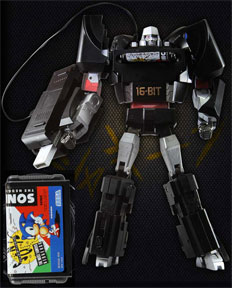 This is "MegaDrive Megatron" he's a real Transformers toy with a cool cartridge addition! Even though he is a bad guy, he turns into the Sega Megadrive AND has a repro original Japanese-look (The Japan cartridge was different than the USA / EU ones) Sonic 1 cartridge. At left, it looks like a normal Megadrive...but then (transforming image is of a non-painted one) it turns into a decepticon!
