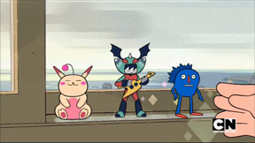The above left cameo has what's probably supposed to be Cloud Strife from Final Fantasy 7, possibly a Roblox looking guy? and an all-blue figure that's clearly supposed to be Sonic, even if it is just an outline of a spiky guy with pointy shoes and gloves. These seem to be sitting on a shelf. The right side cameo has a Pikachu-moogle looking thing, a guitar costume rocker that looks like maybe Adventure Time-esque & then...........Sanic. The poorly-drawn 'gotta go fast' circle Sonic 'creature' from a crayon scribble that got the name "Sanic" as a meme. Because it's just a meme...those aren't copyrighted at all, so it can be directly drawn and then still count as a cameo. It's good silly fun!