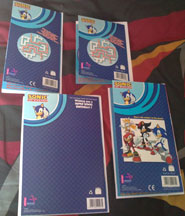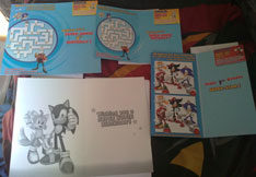 Here are some great Sonic themed birthday cards! Each one has a CG art of Sonic doing something (running, snow boarding, standing with Tails) Two are year-specific (5 & 7) and those special cards come with a plastic pin badge. (seen in upper right corner) So it's like a card with a mini gift! Inside, some have repeats of the art, or mazes. (the maze has a Sonic vs Eggman theme, while collecting rings) There are also character profiles (top right corner) You can see the maze solutions on the card-backs. The one with two pictures is a "spot the differences". The messages are "Have a Super Sonic Birthday, or a variant of "Super # birthday SuperStar" These cards began appearing in 2011/fall. You should be able to find them in ASDA stores.