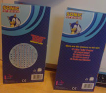 Here are 2 more birthday cards. One is "Superstar 6" the other is "You're 8". Each has a number with stars on it, and a free bonus pin/button (plastic, in top right corner) The inside of the card has the birthday greeting and either a find the word or a Sonic themed quiz. The backs have the answers, ex. the 'master answer' to the word-find you had to spell was "What does Eggman want to turn the world into? A. Eggmanland". The CG art for the fronts keeps them looking fresh/interesting...but look at how concerned Tails looks. These can be bought at Toys R Us stores in England, & are about 2 pounds each. They began to appear in Fall 2011.