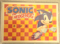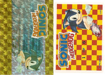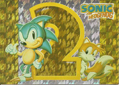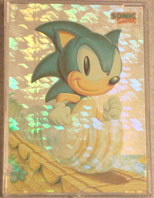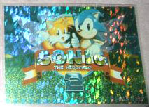 Sonic that the #3 above has, only this time, there's no background. Still, the 'after image' looks neat when seen through the foil cardstock. The #2 has the familiar Sonic 2 logo with wierd Eggman/Robotnick hybrid grabbin' background. The foil effect here enhances the "2" as well as the ground. It appears that all the backs of these are the same, and numbered.