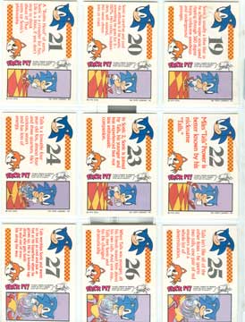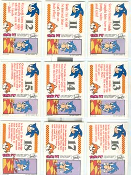 Ah, nice big scans! These are direct from the Sonic Gear collection. If you turn your head sideways, you can even read the backs. As you can see, this first set is comprised of stock arts and title screen captures. What does it say in the corner? "Peel". These are also stickers. The backs are conveniently numbered for your collecting ease. These are shown in a Trading Card plastic slip cover (with binder holes) probably by Fleer or Topps.