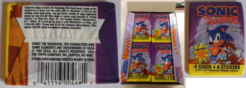 Here is a scan of the package that you would have seen when buying a pack of these trading cards from the Sonic 2 set. You can see the Topps logo, suggested retail price of 50 cents, and it says "Includes Sonic 2 Tips" and "Cards & Stickers" with randomly inserted added, of course. The fine print mentions 2 foil cards are randomly inserted in 2 out of 36 packs. Cards like this (and most all trading cards) were blind-packed.