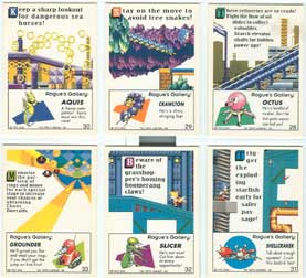 Some of the profiles are useful (EX: Rexxon has a riddle which implies you can stand on the body once you kill the head) but others are downright funny (Clucker "Oh no a chicken with a mission--beware!") It also claims Grabber (spider from chem plant) is 'unpopular'. Umm ok. And that you race Aquis (sea horse in Oil Ocean) But aquis rarely moves, except to shoot a single pellet as you pass.