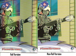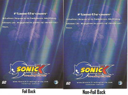 All of the cards had foil variants...for some reason. Clearly they're not as impressive as the old 1990s foils, but they're still interesting. You can sort of see a halo of color on the far left card. Foil effects do not scan or photograph well. The back of the card describes an Eggman attack & why this guy needs a flamethrower.