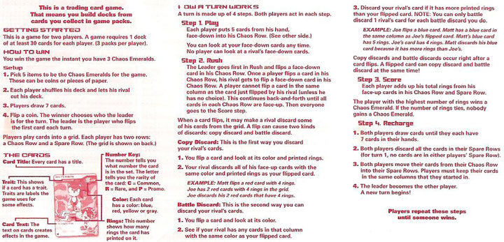The main point of the game is to collect the Chaos Emeralds cards. You have to collect 3 in order to win. Each player puts 5 cards in a row on the placemat. Then they take turns flipping their cards over one at a time. You can discard the other player's card depending on the color and number of rings printed on the card. Then you can add up the total number of rings on all of your remaining face up cards. Whoever has the highest number of rings gets a Chaos Emerald card. You are apparently supposed to repeat the process until someone gets all 3.