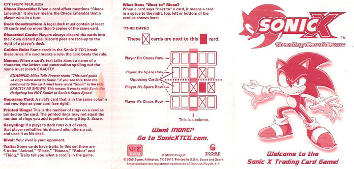 However, the Z-Store also has a very non-descript item you can buy that says it's "The card Game". They should be the 2006 edition cards. It has 110 cards in a box, but doesn't say which series it is. It is $9.99 each, and comes with instructions. They'll ship most over-seas too, which is nice! Push the link above to go to their Sonic-X page if you want to buy it. (This page may also have the Sonic X show DVDs and Keychains)