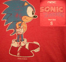 The 'fake vintage' shirt is a pre-faded red color, with 'pre worn out' classic Sonic design. With the close-up you can see the pitting, wear and holes they've purposely added to the paint to make this look old and used, before you even buy it. NEXT is a store in England.