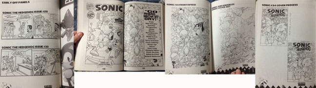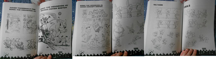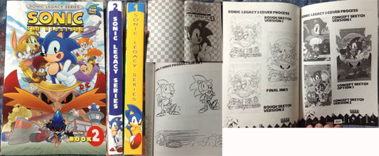 Here is Sonic Legacy issue 2. It's another compilation just like the original, with just as much content. It only looks thinner in the comparison shot because they used a denser/thinner paper. Here you can see the checkered splash page, some Sonic reference type art, cover progress (few details were changed) for this book's prototype cover plus the concepts for it.