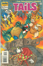 Manak and Mawhinny were the main interior pencillers, and their sloppy, scratchy style was generally unappealing. The comics were also streight-foreward, with no real intellectual plot points or mystery to keep anyone engaged. His 'backup' also consisted entirely of new and un-appealing characters. It didn't help his cause that Tails was portrayed as a somewhat-bratty babyish character who had a huge ego, and would regularly fantasize himself as an ugly super-hero-type. Also: TAILS IS NOT BROWN. My scans aren't bad, it is just that Archie is still insisting that Tails is not orange/yellowish.