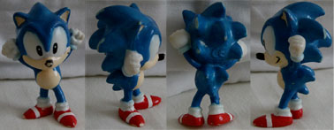 In the gallary is a better look at the 'arms up' Sonic PVC above. As you can see with these photos, they had a decent grasp of what his spikes should look like, even at this early year. You can see the trademark on the back of the head, & it says "C Sega ents. ltd. 1992 Lic by CPL". Notice the paint scuffs; these reveal that he isn't solidly colored plastic like some figures are.
