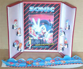 This is a device for displaying the Sonic feves that you see in the close ups at the top of this page. It's a stand -card type thing with a paperboard "display crown" which is probably meant to go along the top of it to help advertise. You can see how the feves stick to black squares along the sides. The card says something in French. (If you know French, do write in, the text is available) Where would this be displayed though? Feves are meant to be baked into cakes for the Epiphany of 3 Kings (it's a religious holiday) and if you got the feve in your slice, it would bring you luck throughout the year. Look how poor Sonic's face looks from the side. It's all bent in. The flicky is completely orange while the art shows it as blue. The display crown art right next to the feves kind of reminds people that they didn't seem to be trying too hard with the paint jobs here.