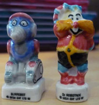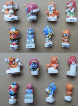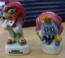 characters have all appared as feves, so why should Sonic be an exception? They are often hand painted, leading to odd looking paint jobs and variances between figures. (look at how Knuckles has a green body & legs) Each base is labeled and dated, and they're all quite early, with the Sonic being from 1991. Knuckles & Motobug there are probably later figures. Burrobot & Dr Robotnik are 1992. You can tell they're stock art inspired, but they do try to get the detail going. "Feve" may translate from French as "Bean".