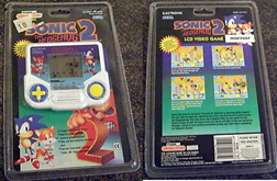 Tiger did an LCD game for each of the first 3 Sonic titles on the genesis, so hre's Sonic 2. It looks like possibly Oil Ocean in the background. The button layout is the same as the first game. The art on this one looks slightly more sophisticated. You can also see what it looked like new, in the impossible to open without destroying the box, box. Unfortunately, you can't read any of the text.