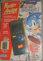 The "Amazing Sonic" Pocket Arcade LCD game. This has a 'pop-up' lid to cover the game screen so you could take it with you safely. (there was another Pocket Arcade Sonic with 'flip up lid') You can see the graphics on the back. This card says "Sonic & Robotnick are at it again. The Diabolical Dr. Robotnick has created a robot factory and it's up to Sonic to stop the metal mutants. Sonic works his way through maze-like rooms in an attempt to remove the Chaos Emeralds, the factory's only power source. Team up with Sonic through 12 levels of fast and furious action as he tries to put Dr. Robotnick out of business for good!"