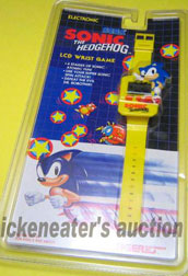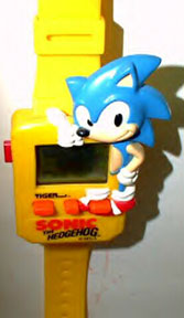 This is a LCD game set up to look like a watch. This did NOT function as a watch, all it did was play a mini game. Made by Tiger Electronics, these are not too common. The Sonic head is also fragile, so you can find broken ones. From the screen shot, you can see that you could dodge badniks (buzz bomber) had lives, and it kept score. Want to see the manual? It's on SonicRetro. MIP, Screen Shot images by ChickenEater, discovered by PiplupFan77