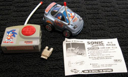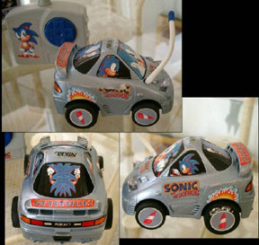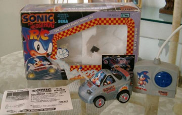 This is an interesting find. This detailed R/C race car was made by Nikko America in the 1990s. It was likely found at Radio Shack and other stores that had remote cars. As you can see, it's covered in decals and details, such as shoe pictures on the tires, and Sonic from every angle. It uses 4 AA for the car and 1 9v for the remote.