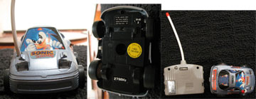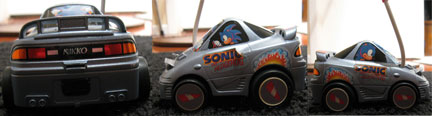 With these photos, you can see there was a red accented variation on this car/control set. *colors may indicate Mhz, this one at 27 Mhz. The car is a short/squished version of the Mitsubishi 3000GT, and it is at 1/26 scale. It's sort of odd how the different 'views' of Sonic all have him at different sizes. Look at the windshield, he's so huge there, while one 'side' has him far smaller than the other. It's a quality little car though, with headlights that really light.