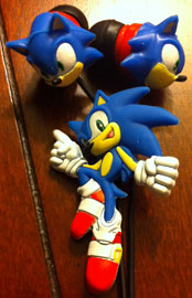 This pair of earbuds is made to go along with the Sonic theme MP3 player and radio. But, they'll work with anything that has a headphone jack. They're nicely detailed with 3D Sonic faces on the exterior of the buds. They're almost classic looking (they'd have to be! To keep the spikes short enough to wear) but do have the green eye detail. The cords are kept neat by the Sonic shaped rubber piece. This is that same cut-in relief material that some of the most popular keychains are made of. The jumping pose looks nice, and the material captures the detail.