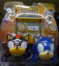 For some reason, mobile phones have not made walkie talkies obsolete enough, so this pair was produced in the fall of 2010. The units are shaped like the semi-3D heads of Sonic & Shadow. Due to the shortened spikes Sonic appears 'classicly styled' even though he's not supposed to be, and Shadow does as well, even though he was never classic! The effect is interesting, and the heads seem well made. Each has an antenna, and 'talk' button (see it there, by the right ear) There are likely mic. & speaker holes on the backs of their heads. These will need batteries (likely AA) to run, and were licensed out by Jazwares. The middle sticker says "Only at Toys R Us" so these are an exclusive, and the other sticker says "Secretly Chat with Your Friends". How much do these generally sell for? MIP photo by Taaron, plain photo discovered by KnucklesToast.