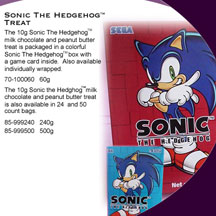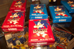 Here's something interesting, 2 different kinds of Sonic Adventure 1 chocolates. One is a bar with peanut, peanut butter, and caramel, coated in chocolate. The other is a peanut butter cup (complete with edge-ridges) which must be like a Reesy Cup. The last is the store display you never saw them dispensed from! Canadian Sonic Adventure 1 Chocolates