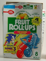 Fruit Roll Ups are thin sheets of compressed semi-translucent fruit flavored substance. They're kept 'on a roll' by a thin sheet of plastic. To eat it, you peel it off. They were developed plain at first, then had various shapes pressed in (so the shapes could be peeled apart from the rest of the roll) to make them more fun. Eventually, they did 2 different flavor/color promotions for Sonic. The first "Crazy Colors" features 3 different colors/flavors of substance, with designs stamped in it (like Sonic, Tails, Rings, etc) The second (right) has hot colors, where each roll is a different color (will dye mouth too) and has the same set of designs stamped in.