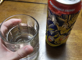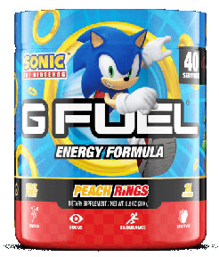 Here are the 2 ways you can try "Peach Rings" Sonic's flavor of G Fuel drinks. They have tall cans at left, and a powder jar at right where you can mix your own with water. The can is quite nicely designed with a yellow/blue crosshatched spiral & a scattering of rings. It has jumping peace-sign modern Sonic all over one side. The shading is a bit comic book style for him.