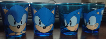 They're made to match the pint ones patterns (above) & come in this nice checker themed box. This set can be found at Spencers Gifts in 2011 & 2012. It should be about 19.99 for the set. Why are the tiny glasses the same price as the large ones? It seems a little strange that one doesn't cost less than the other. The glasses themselves are tinted blue, which is a nice touch. They have solid glass/heavy bases, as is the tradition with shots. The 'oh Sonic' art here is likely neo-classic. Notice the 20th Anniversary item logo at the bottom of the box.