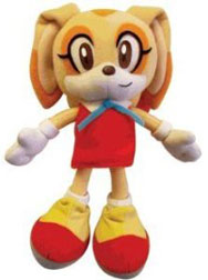 Here are 2 different Cream the Rabbit plushes by GE Entertainment. The left one is their small, 6 inch size, and was released at some point in 2011 (but where?) The right is larger (but how much bigger?) and is new for 2012. They're bothquite good plushes, with nicely done faces, good proportions, and proper details. (small socks, blue bow, white collar for the dress, etc) The larger size one is VERY like her Sonic X look, even the mouth is open for a cute smile expression. The big ears she flies with are also really great here.