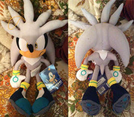 GE Entertainment has made a Silver the Hedgehog plush in 2013. He has been confirmed at 8 & 13 inch sizes. This photo is for the 13 inch. The plush looks pretty darn good here. Head spikes stand up appropriately, gloves & boots are well detailed & the eyes look decent with good placement & black borders. His flaw in the factory photo at left, is that he only has 3 fingers, which is inaccurate. How much will this cost at retail? Where will he be sold?