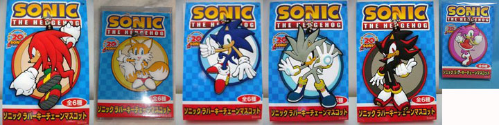 Here is a full set of Segaprize keychains. These are rather large (for a keychain) and made of die pressed/cut flexible rubber. It's the same stuff the older USA keychains were made of, which holds detail quite well, and is layered. You can get Knuckles, Tails, Sonic, Silver, Shadow or Amy Rose. They were produced for the 20th Anniversary (as seen with the logo on everyone's card) You can sort of see their lead-loop at the top of the card. These feature new poses that weren't issued on previous rubber keychains. A nice set! Sometimes find-able on ebay. Were these a UFO prize?