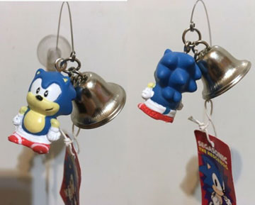 These are a type of dangler that takes 'door bell' literally by allowing you to have a tiny bell for your door. Each one has a 'chibi style' little-big-heads 3D figure of a character, and the same small silver metal bell. The bell hangs from the characters' feet, and the clapper has a full color 2 sided flat paper tag/card with a different pircture on each side. The character & bell are suspended on a thin, flexible metal wire that's attached to a suction cup.