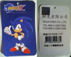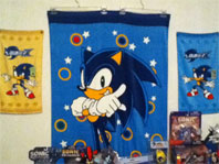 This is a big beach-size towel for Sonic X. Notice how complicated the Sonic X title looks when it's written in Chinese. The "X" is the same but that whole rest of it is the title. The towel has rings, stars, & colored dots. The tag has the license info, & likely price barcode. To the right, you can see the size of the towel as it hangs from 2 hangers above a collection of Sonic stuff.