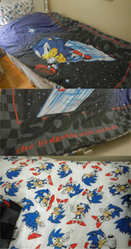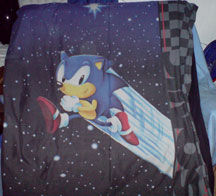 In the gallary is s the matching bed-spread to the above pillow case. Each has a checkered border, with the spread having it up only 1 side, for an interesting look. It features a classic looking Sonic jumping through either 'outer space' or the sky at night, complete with a large star at the top. If you look carefully, you'll see that the sky is also a gradient from blue to black for added interest.