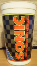 The whole background is checkered in black and gray. It's pretty old, at 1991, and has a super chubby style jumping Sonic stock art on the front. Look at where they put the line for his back! The back of the cup simply says Sonic and the usual "HWA".