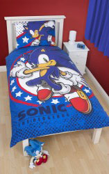 Here are 2 more single size blankets / duvets. These appear to come with a matching pillow case, but no sheets at all. They look kind of small, even for the dinky single size kids bed/they don't hang over the edge any. The left has two different stock modern Sonics in star circles, with star bumpers & logos. The pillowcase is just a smaller version of that same pattern. The right has jumping modern Sonic in a single large star circle, with logo at the bottom. It's pillowcase is different, with running Sonic on a white background & cropped/cut off star-circle. These should be between 24.99 and 16.99 pound. They are both available in 2013 at characterworld.uk.com , in the Sonic section.