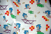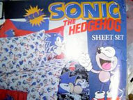 This pillow case interesting due to the large ruffle border. Where was it available? On the set, but possibly also separately. A rather traditional pattern of the various poses of stock-art sonic appears all over the white background. It is not a pillow, just a case, though someone has supplied one for this photo.