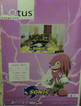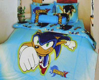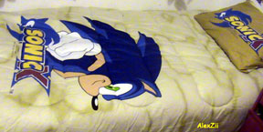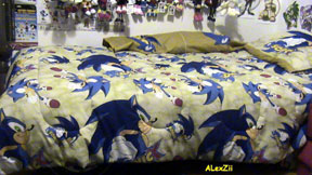 In the gallary you can see the 'whole set' to the blue pillow cases you see above. As you can see here, if you obtian everything (an expensive proposition) you'll have 2 regular pillow cases, a tube pillow, sheet, and the comforter/bedspread. Each one has the leaping punch Sonic, with a yellow aura around it. It looks like this will go onto a twin bed. The design is not too busy, but it isn't original or 'something different' either. Still, who wouldn't want something like this to help finish their Sonic Room?