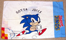 These photos are 2 sides of the same pillow case. It's a rather simple thing, with a few checkers and a blue band with "Sonic" on it, as well as the old standby stock-arts. The curious thing about this is the sayings written on it. "Way Cool" on one side and "Gotta Juice" on the other. As you know, "Gotta Juice" is ONLY from the SatAm Sonic show, (at this time) where running was referred to as 'juicing' for some reason (although now it means using steroids...) That makes this one of few things from the USA that actually reference the SatAm show. This is copyright in 1994 though.